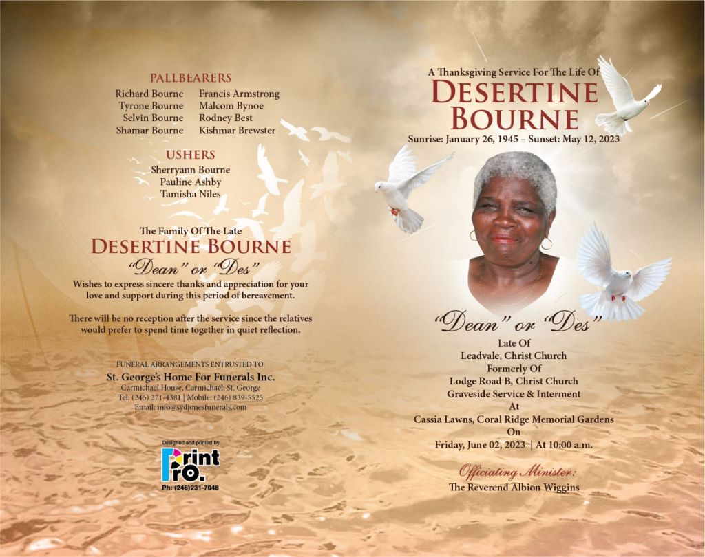 Desertine Bourne Funeral Service – June 2, 2023, 10:00AM at Coral Ridge May 23, 2023June 19, 2023 A. Jackman Watch on YouTube The Funeral Services will be held by the gravesite At 10:00am Coral Ridge Memorial Gardens On Friday June 2, 2023 Published by A. Jackman View all posts by A. Jackman